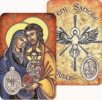 Card Pvc Sacra Famiglia icona , sul retro Spirito Santo con medaglietta , formato cm.5,5x8,5.