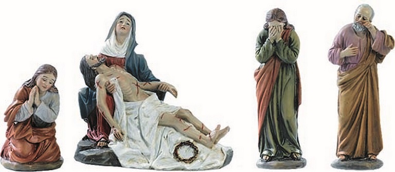 Addolorata con Gesù morto e altri soggetti a completare la scena - statuette in resina alt. cm. 13 (con scatola)