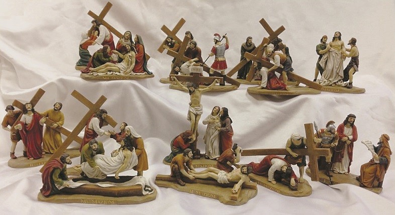 Via Crucis composta da 14 statue in resina dipina (con scatola) - statue da cm.9 - altezza totale da cm.12/16 circa in base alla scena