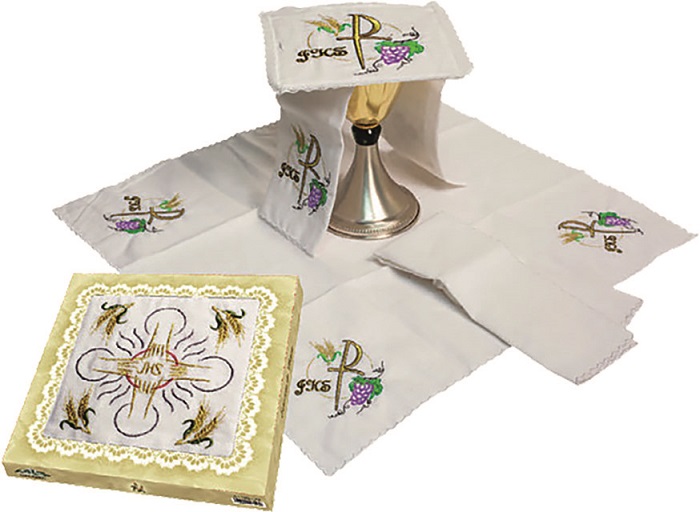 Servizio da messa in lino composto da corporale (48x48), palla (16x16), manutergi (23x48) e purificatoio (23x48)