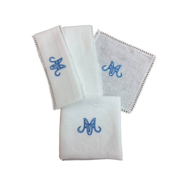 Servizio da messa arricchito con prezioso ricamo ecclesiastico Mariano, in lino 100%, tutti i pezzi sono contornati da elegante e raffinato merletto in cotone.