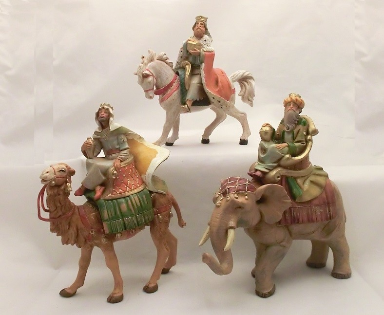 Serie 3 Re Magi su animali in resina tipo legno dipinto a mano presepio cm 12 Fontanini.