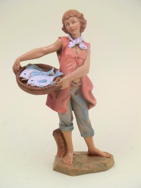 Pescatore con cesto di pesci in resina tipo legno dipinto a mano presepio cm 19 Fontanini.