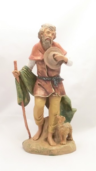 Pastore con bastone, cappello e cane in resina tipo legno dipinto a mano adatto per presepio cm 30 Fontanini.