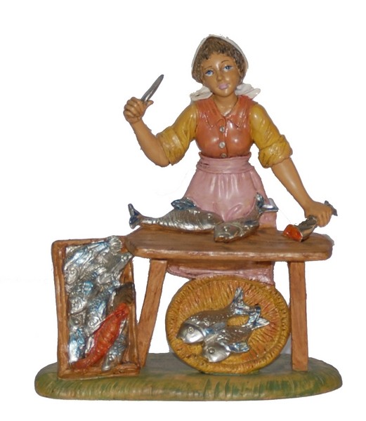 Pastore doppio, donna con banco pesce - presepio resina tipo legno cm. 20