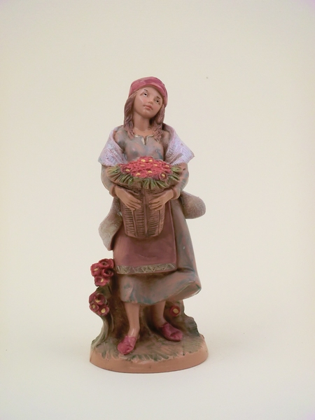 Donna con cesto di fiori in braccio in resina tipo legno dipinto a mano presepio cm 12 Fontanini.
