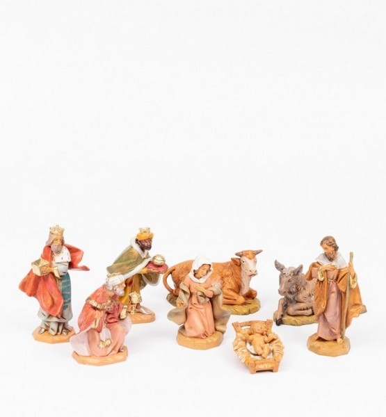 Nativtià 8 pezzi (Madonna, S. Giuseppe, Bimbo in culla, asino, bue e tre Re Magi) presepe Fontanini cm. 12 in resina tipo legno