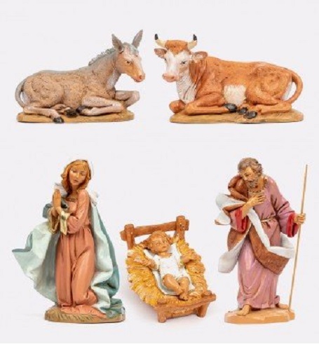 Natività 5 pezzi (Madonna, S.Giuseppe, Bimbo in culla, Bue e Asino) in resina tipo legno dipinto a mano adatta per presepio cm 30 Fontanini.