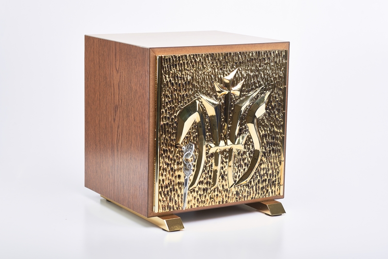 Tabernacolo Esposizione IHS - misura esterna: cm.26x28 profondita' cm.23 - misura interna : cm.22,5x22,5 profondita' cm.18 - larghezza/altezza utile cm.22x22. Tabernacolo con porta blindata in fusione di ottone 24K, costruito in robusto legno tamburato da 2 cm., con interno in lamiera di ottone dorato da 1 mm. e pesanti piedi di bilanciamento dotati di quattro comodi fori , asportando i feltrini presenti e sostituendo le viti secondo le esigenze e' possibile fissarlo stabilmente nella sede definitiva.La porta e' in fusione a terra, artisticamente decorata con i piu' classici simboli eucaristici.Tutte le dorature sono in ORO zecchino a 24K, saldature ad argento. I materiali di assemblaggio e finitura, comprese le scocche in legno, sono prodotti italiani di prima qualita'.