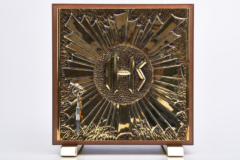 Tabernacolo Esposizione IHS - misura esterna: cm.26x28 profondita' cm.23 - misura interna : cm.22,5x22,5 profondita' cm.18 - larghezza/altezza utile cm.22x22. Tabernacolo con porta blindata in fusione di ottone, costruito in robusto legno tamburato da 2 cm., con interno in lamiera di ottone dorato da 1 mm. e pesanti piedi di bilanciamento dotati di quattro comodi fori , asportando i feltrini presenti e sostituendo le viti secondo le esigenze e' possibile fissarlo stabilmente nella sede definitiva.La porta e' in fusione a terra, artisticamente decorata con i piu' classici simboli eucaristici.Tutte le dorature sono in ORO zecchino a 24K, saldature ad argento. I materiali di assemblaggio e finitura, comprese le scocche in legno, sono prodotti italiani di prima qualita'. Tabernacolo IHS. I ltrigramma IHS e' un'abbreviazione di IESOUS in greco antico. Nel medio evo il simbolo fu diffuso da San Bernardino da Siena e pio fu adottato da Sant'Ignazio di Loyola come simbolo della compagnia di Gesu' : IESUS HOMINUM SALVATOR - Gesu' salvatore degli uomini. Oggi IHS e' il simbolo inconfutabile del Nostro Signore.