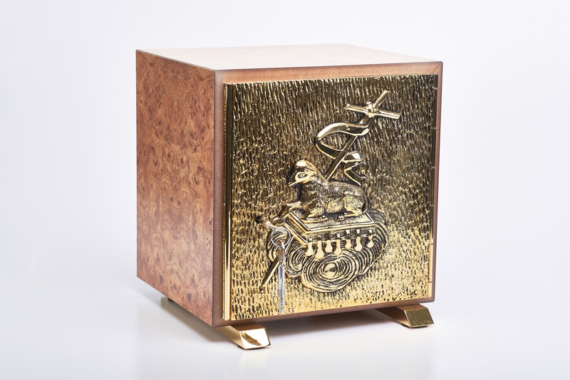 Tabernacolo Agnello - misura esterna: cm. 26x28 profondità cm. 23 - misura interna: cm. 22,5x22,5 profondità cm. 18 - larghezza/altezza utile cm. 22x22. Tabernacolo con porta blindata in fusione di ottone, costruito in robusto legno tamburato da 2 cm., con interno in lamiera di ottone dorato da 1 mm. e pesanti piedi di bilanciamento dotati di quattro comodi fori, asportando i feltrini presenti e sostituendo le viti secondo le esigenze è possibile fissarlo stabilmente nella sede definitiva. La porta è in fusione a terra, artisticamente decorata con i più classici simboli eucaristici. Tutte le dorature sono in ORO zecchino a 24K, saldature ad argento. I materiali di assemblaggio e finitura, comprese le scocche in legno, sono prodotti italiani di prima qualità. Tabernacolo Agnello. È l'immagine del Cristo. Fa riferimento ai sacrifici del tempio; la sua mansuetudine richiama l'obbedienza di Gesù al Padre. Le immagini più antiche ce lo mostrano coricato, per il patimento del Sacrificio. Rimanda però anche al Cristo risuscitato e glorificato. In questo caso L'Agnello si afferma come dominatore dell'universo, è trafitto eppure è vivo perché risorto. Nella nostra rappresentazione, è coricato sul libro dei sette sigilli dell'Apocalisse che identifica tra i protagonisti l'Agnello in Cristo.