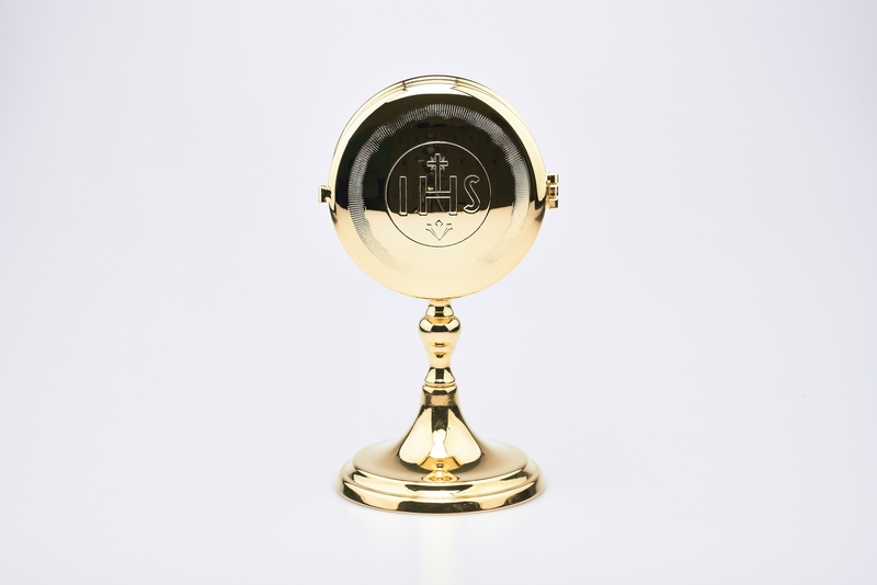 Scatola porta ostie con lunetta su base in ottone dorato diam. cm. 9 altezza cm. 18.