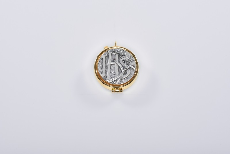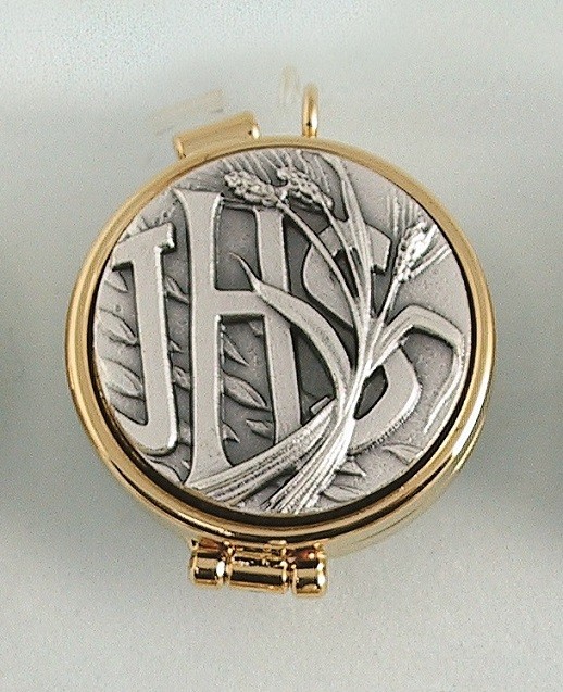 Teca mignon metallo dorato placca peltro IHS grano- diam. cm.4