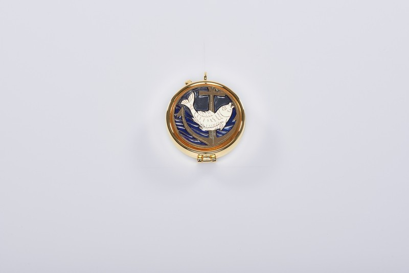 Teca mignon metallo dorato placca con smalti Pesce - diam. cm.4