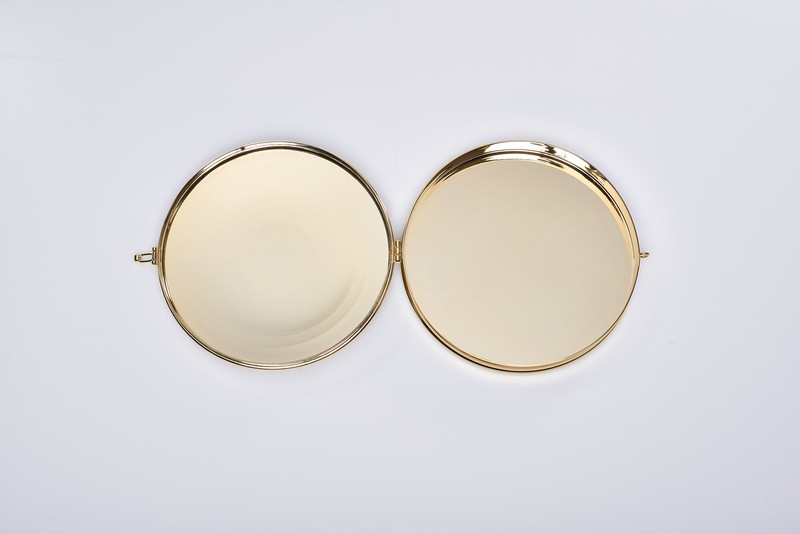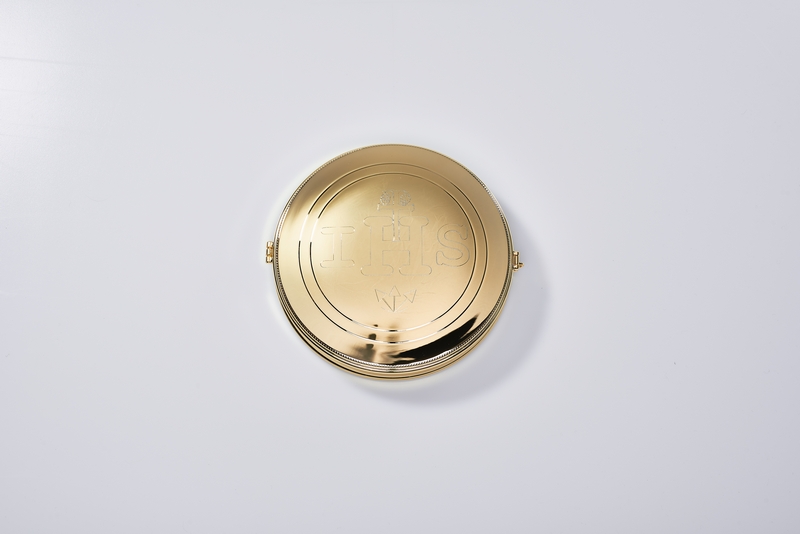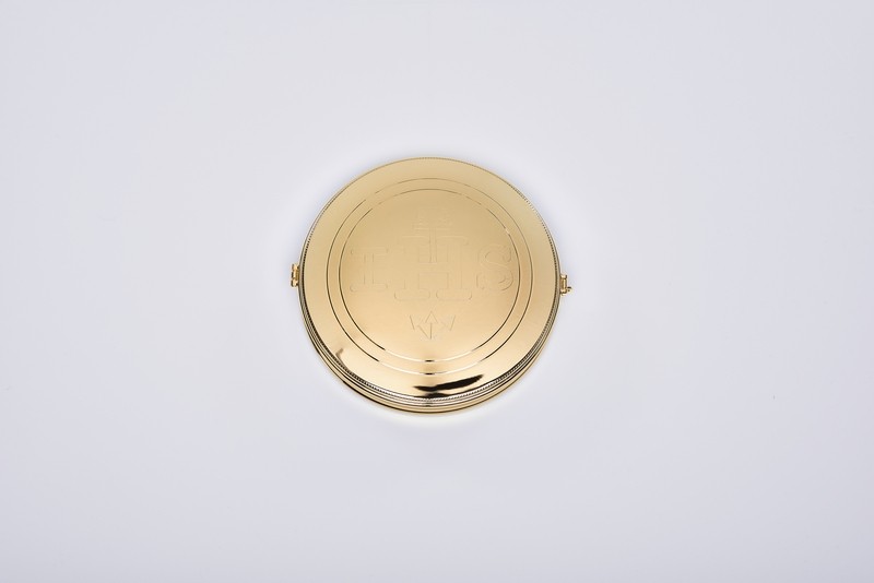 Teca porta Ostia Magna in ottone dorato, chiusura a clips, trigramma IHS. Ø cm. 17x3