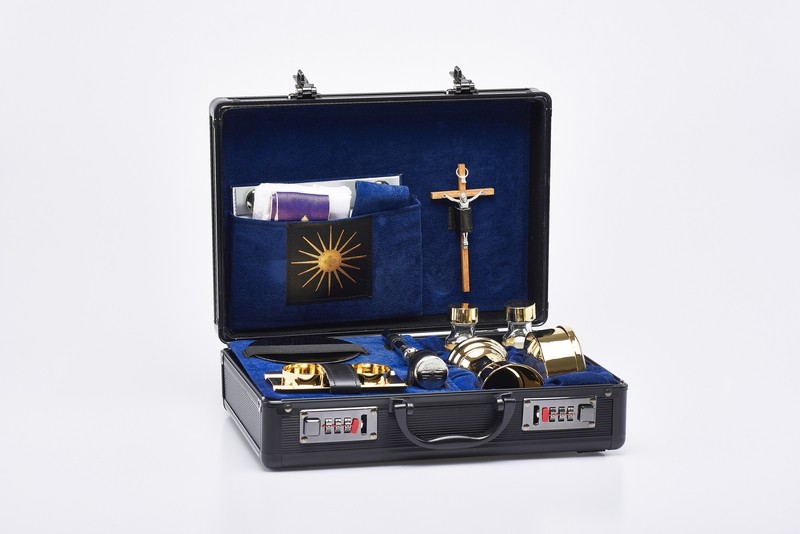 Valigia per celebrazione con amplificatore - misura cm. 31x23x9, contiene tutto il necessario per la celebrazione. Calice, patena, grande scatola per particole, bottogliette per acqua e vino su vassoio, altarino lavabile, candeline, crocefisso, aspersorio, vasetto olio, tovagliolini e stola. Inoltre, in un doppiofondo, vi è inserito il nostro amplificatore portatile (art. A190), per celebrare in spazi aperti sicuri di essere uditi fino a 100 metri.