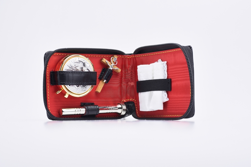 Bustina portaviatico in pelle di vitello - misura cm. 9x11x2 - contiene teca, crocifisso, asperges e purifichino