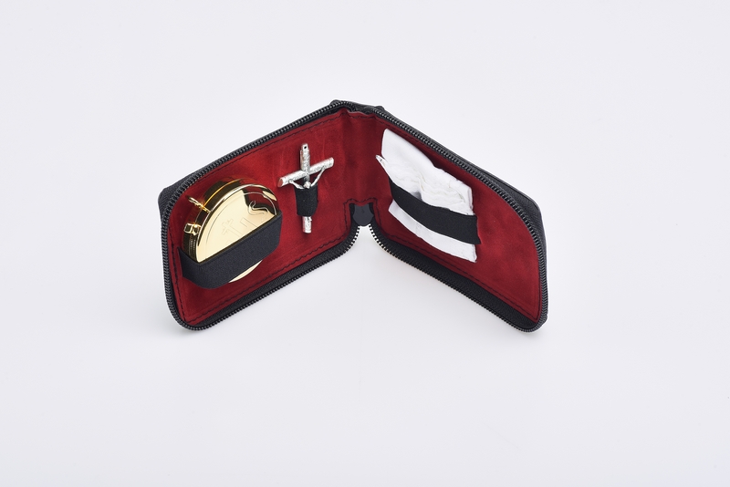 Bustina portaviatico in pelle di tipo economico - misura cm. 9x11x2 - contiene crocifisso, teca dorata con IHS e purifichino