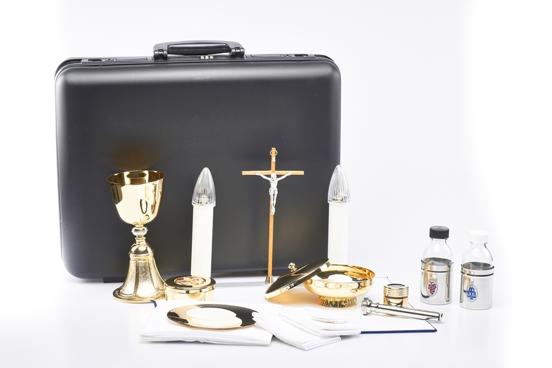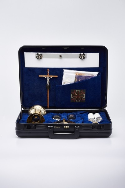 Valigia per celebrazione interno blu - misura 38x46x12 cm. - rifinito con cura - Telaio in alluminio. Contiene il necessario sia per la celebrazione che per i viatici. Si presenta con un aspetto molto ordinato, ma che permette l'inclusione di un camice molto sottile. All'interno metalli importanti, un calice da cm. 18 di diam. cm. 9 alla bocca, pisside offertoriale diametro cm. 12, candele sia in cera che elettriche e il normale ricco assortimento che accompagna abitualmente i nostri completi: tovaglie ricamate, stoletta bicolore, piano lavabile, bottiglie corazzate con decorazione applicata, scatola per particole di grande capacità, ecc..