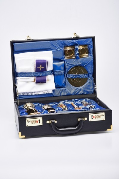 Valigia per celebrazione "Serena" - misura 24x36x12 cm. - Valigetta in pelle molto portabile e poco ingombrante, contiene il necessario sia per la celebrazione che per i viatici. Calice e pisside sono alti cm.11, molto belli, le ampolline sono di tipo ermetico, con vassoio apposito, il tutto dorato fino; è un completo piccolo ma di grande effetto