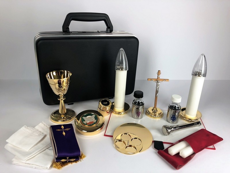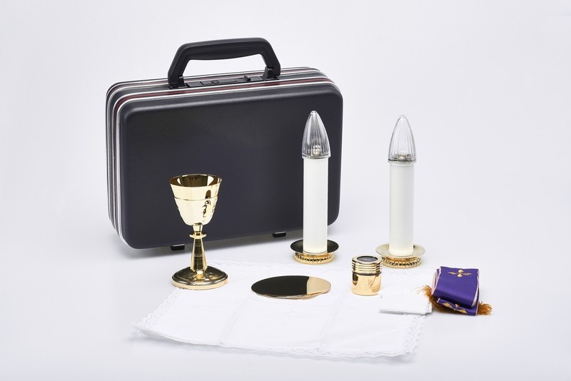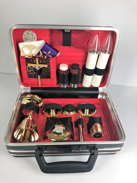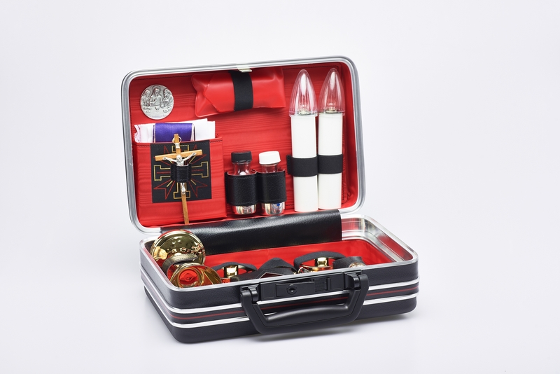 Valigia per celebrazione "Ultima Cena mini" - misura 21x30x10 cm. - Completo piccolo e molto accessoriato, con varie accortezze che lo distinguono. Candelieri indipendenti, candele anche elettriche, viatici, guscio robusto e compatto, senza spigoli; un aspetto gradevole per un oggetto di lusso