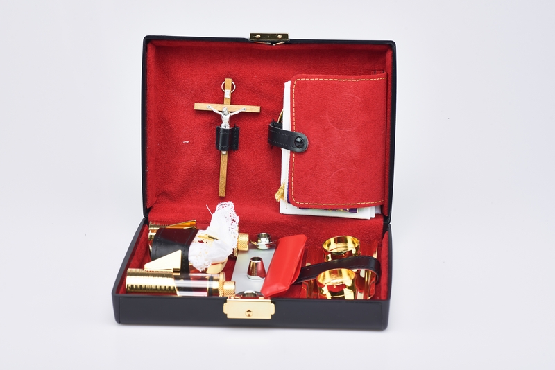 Astuccio lusso da viaggio dimensioni ridottissime - misura 14x20x5 cm. - rifinito con cura - oggetti particolari, ampolle ermetiche, calicetto componibile e piccola patena, altarino, scatola per particole, tovaglie ricamate, stoletta ecc..