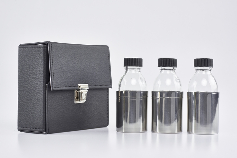 Astuccio con tre bottiglie con corazza solo per oli santi - 125 cc. ( astuccio cm. 16x14x6,5)