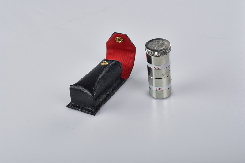Due vasetti a colonna in metallo per oli santi in astuccio - diam.2,6 cm alt.6 cm.. Decorazioni disponibili : CHR - CAT - INF-