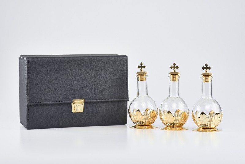 Astuccio con 3 Fiaschette per oli santi in vetro con tappo a vite, capienza 100 cc. -- alt.cm.15 diametro cm.7 dimensioni astuccio: 16x24x11 cm.