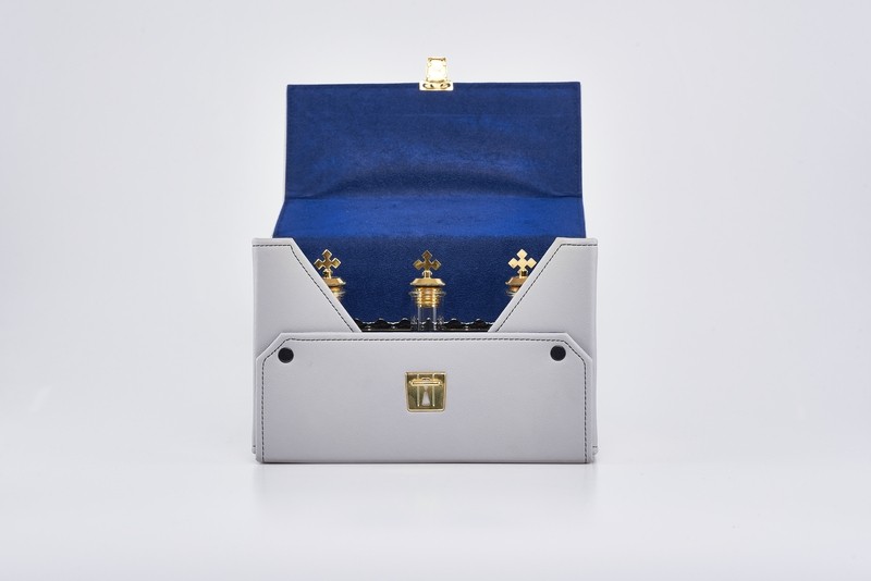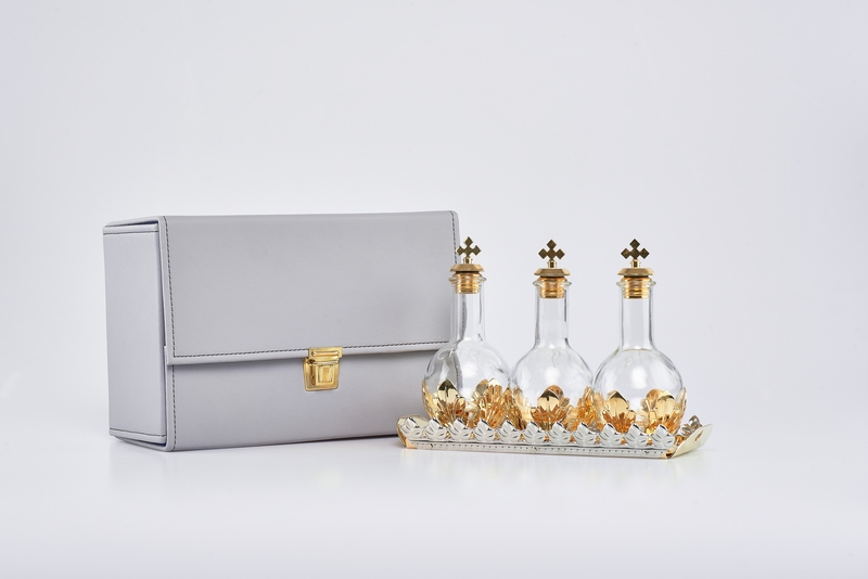 Astuccio con 3 Fiaschette per oli santi in vetro con tappo a vite su vassoio a tre posti, capienza 100 cc.-- alt.cm.15 diametro cm.7.