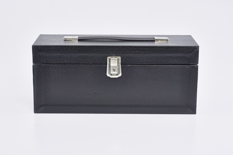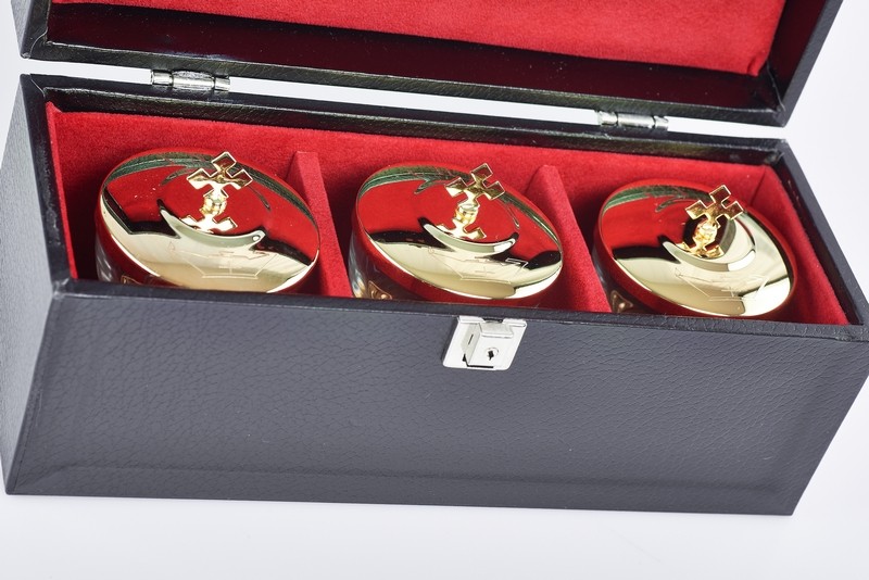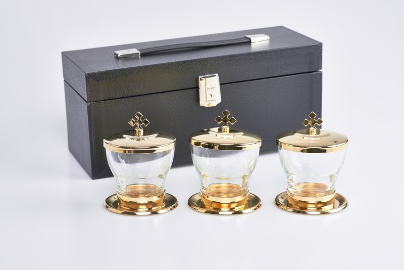 Tre vasetti da altare per oli santi con incisione - 50 cc., in custodia rigida cm. 27 x 11,50 x 1.