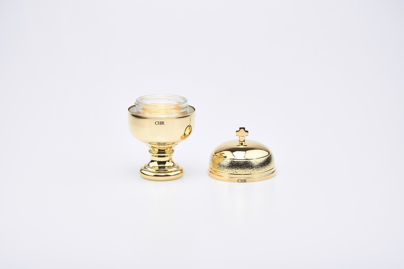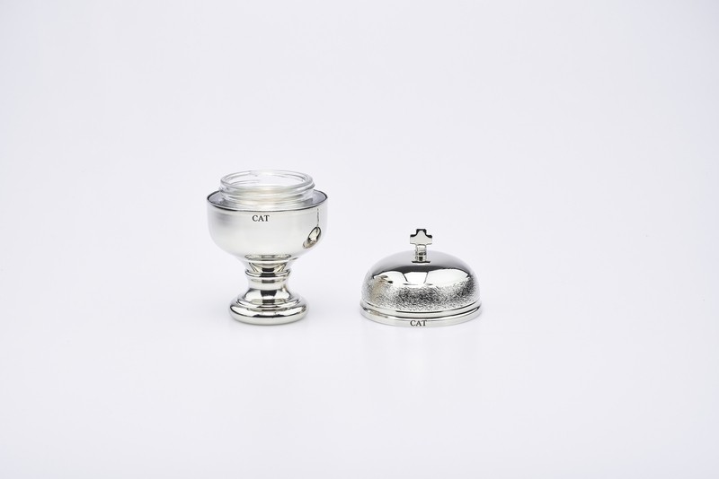 Vasetto per oli santi " CRISMERA" con interno in vetro 50 cc.,incisioni : CHR - CAT - INF- alt.cm.10,5 diametro c. 6,5 (base diam.cm.4,2).