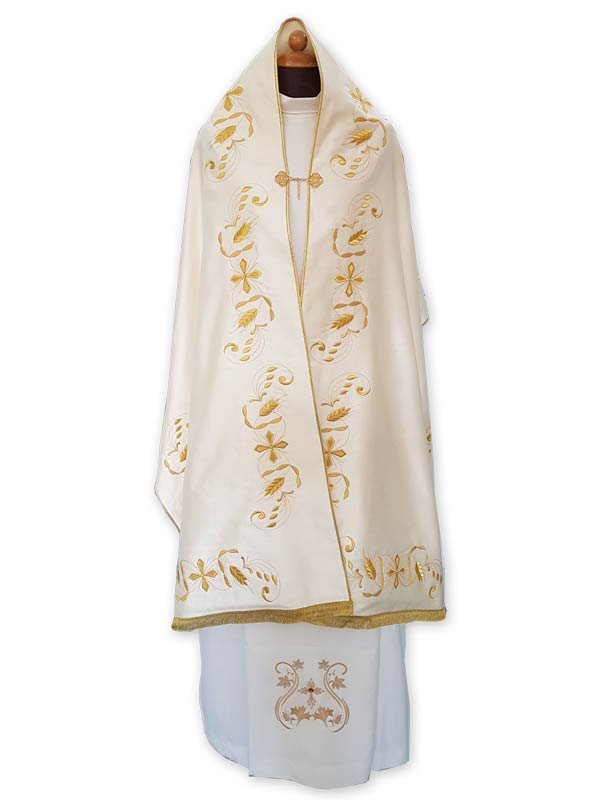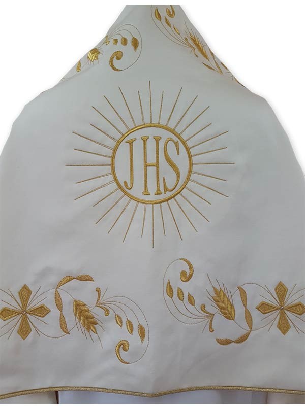 Velo Omerale realizzato a mano da artigiani italiani, contornato da ricami dorati arricchito da pietre luminose (gancio compreso). Confezionato in tessuto di raso di cotone (cotone 66%- poliestere 34%) in colore avorio. Misure cm. 65x250.